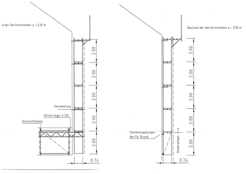 Die Lösung besteht in aller Regel aus Schwerlast-Gitterträger-Verbindungen, vertikal verstärkt mit Gerüstrohren, die über die Anbauten hinweg frei angebracht werden, um das darüber aufzubauende Gerüst sicher zu tragen.