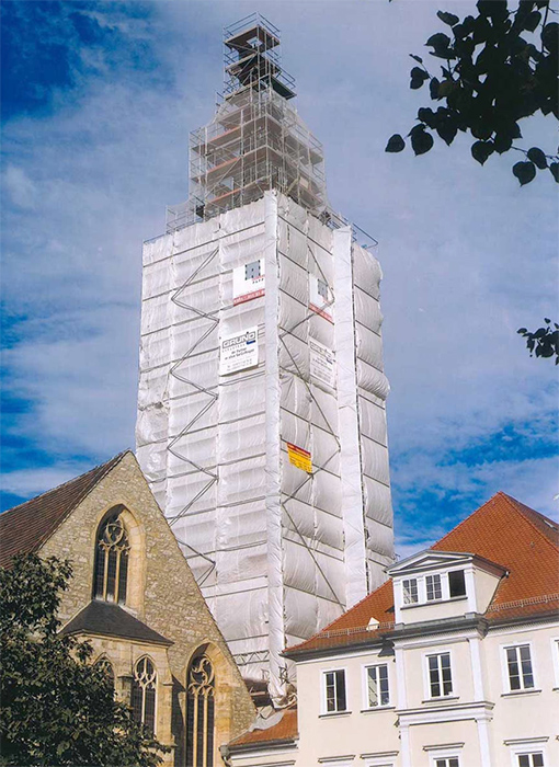 » Kirchensanierung bzw. nicht zu belastende oder vorhandene Untergründe. Bei Kirchensanierungen kommt es häufig vor, dass Anbauten am eigentlichen Kirchenschiff nicht die Stabilität aufweisen, um Lastabtragungen vom Gerüst aufzunehmen. Es müssen deshalb meist aufwändige Trägerkonstruktionen geschaffen werden, um die Gerüstaufbauten auf „sichere Füße“ zu stellen.